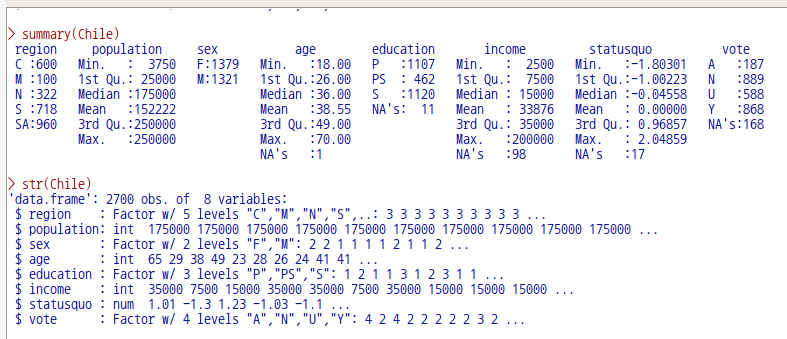 The Chile data frame has 2700 rows and 8 columns. The data are from a national survey conducted in April and May of 1988 by FLACSO/Chile. There are some missing data.