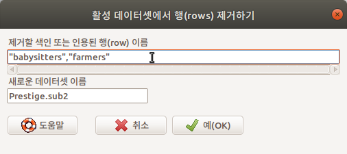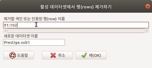 예를 들어, Prestige 데이터셋은 6개의 변수와 102개의 사례가 있다. 91번부터 102번까지 12개의 사례를 제거하려고 한다. 다음과 같이 '91:102'를 <제거할 색인 또는 인용된 행(row) 이름> 에 입력한다.