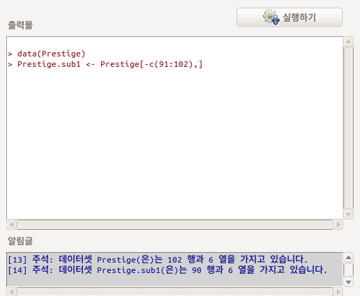 Prestige.sub1 데이터셋에서 babysitters, farmers 두개의 사례를 제거했기 때문에, 알림글의 지시문을 보면 사례수는 90개에서 88개로 줄어들었음을 확인할 수 있다.