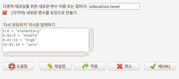 Prestige 데이터셋에 있는 수치형 변수 education의 구간을 만들어 사례값들을 넣고 요인형로 변수로 만들고자 한다. 아래와 같이 <'다시 코딩하기' 지시문 입력하기>에 입력할 수 있다. 1부터 6까지는 elementary로, 6.01에서 9까지는 middle로 , 9.01에서 12까지는 high로, 12.01에서 16까지 univ라는 구간명을 만들어 넣을 수 있다.