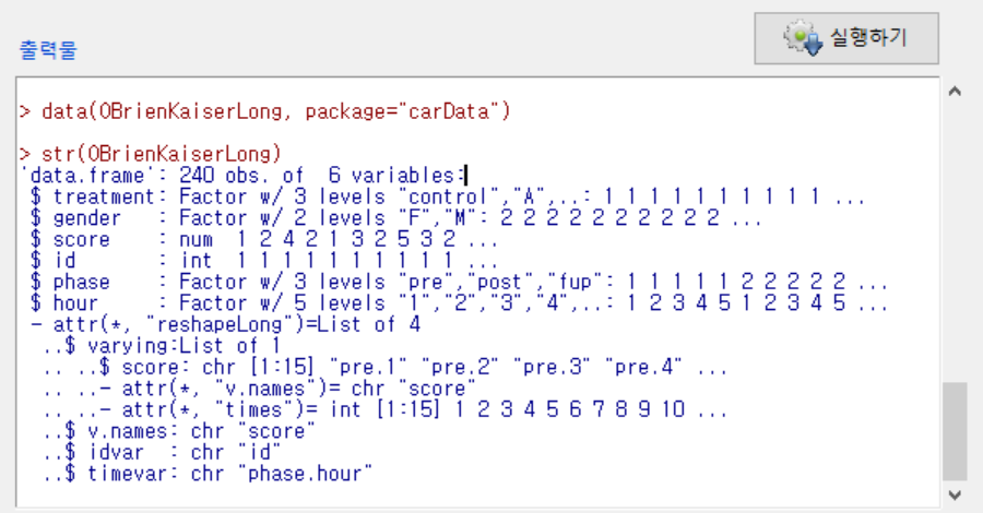 str() 함수를 활용하여 입력창에 직접 str(OBrienKaiserLong)을 입력하고 실행하여, 출력창에 다음과 같이 OBrienKaiserLong 데이터셋의 구조적 정보도 확인할 수 있다.
