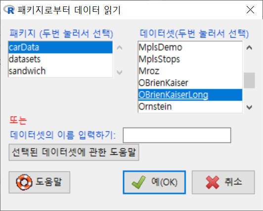OBrienKaiserLong 데이터셋은 carData 패키지에 포함되어 있다. carData 패키지는 Rcmdr 패키지가 호출될 때 자동으로 함께 호출되기 때문에, OBrienKaiserLong 데이터셋을 R Commander에서 메뉴기능을 통해서 활성데이터셋으로 불러올 수 있다.