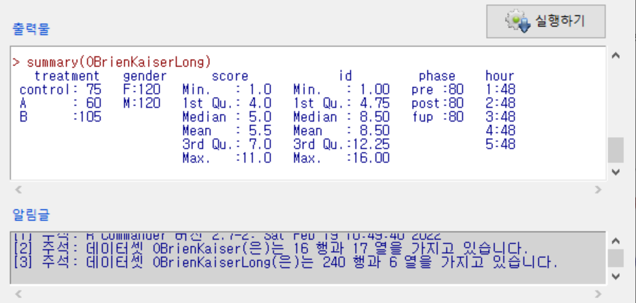 통계> 요약 > 활성 데이터셋 메뉴를 통하여 OBrienKaiserLong 데이터셋의 요약정보를 확인할 수 있다.