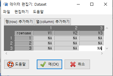 변수 3개(V1, V2, V3), 사례 3개(1, 2, 3) 등으로 열과 행을 추가할 수 있다.