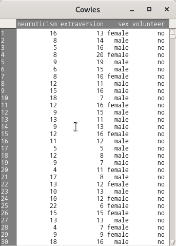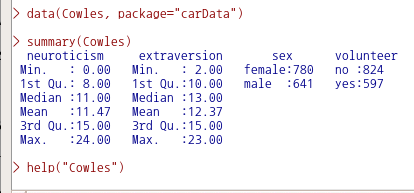 The Cowles data frame has 1421 rows and 4 columns. These data come from a study of the personality determinants of volunteering for psychological research.