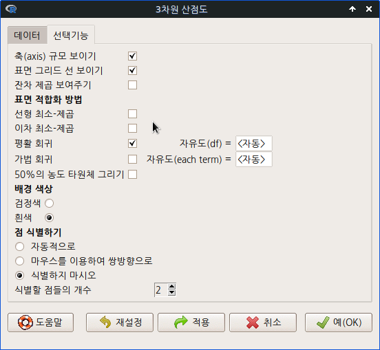 <선택기능> 창에서 '축(axis) 규모 보이기', '표면 그리드 선 보이기'를 선택하고, <표면 적합화 방법>에서 '평활 회귀'를 선택해본다.