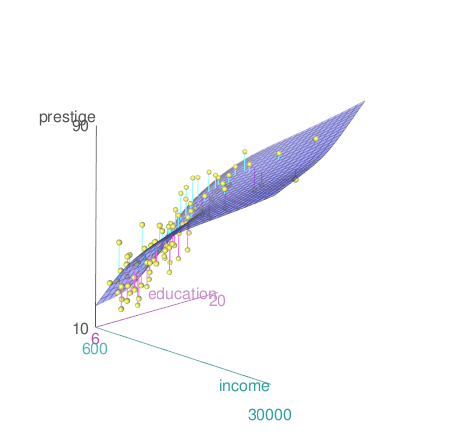 scatter3d(prestige ~ income + education, fit=c("linear", "additive"),