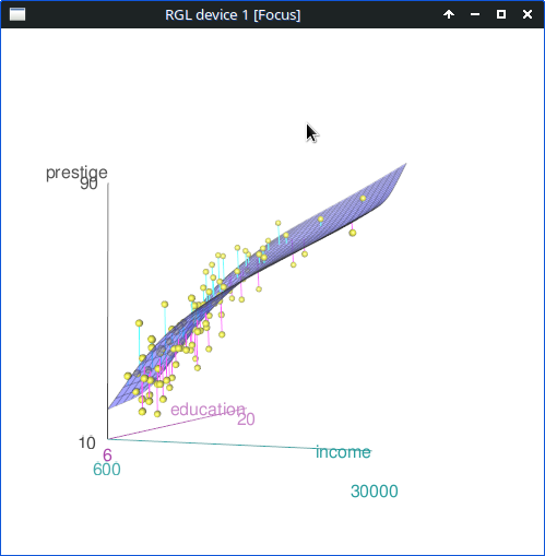 carData 패키지에 있는 Prestige 데이터셋을 활성화시키자. 교육연수와 연소득이 직업의 사회적 권위에 미치는 영향을 점검한다고 생각하자. <설명 변수 (두개 선택)>에 education, income을 <반응 변수 (한개 선택)>에 prestige 변수를 선택한다.
