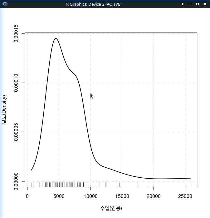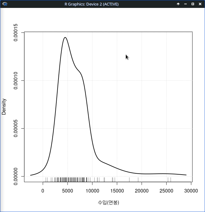 밀도 그래프(densityplot)은 수치형 변수를 촘촘히 배열하면서 그 사례사이의 거리를 역으로 밀도화시키는 방법이다. 줄여 말하면, 거리가 가까우면 밀도가 높고, 거리가 멀면 밀도가 낮게 계산되고 시각화된다. Prestige 데이터셋의 income 변수를 사용해보자.
