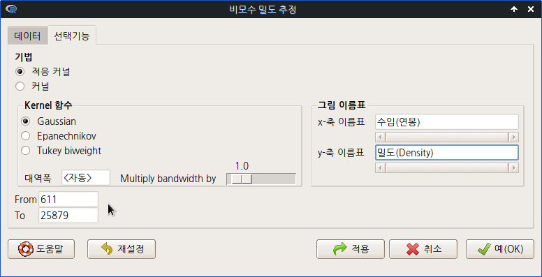 method="adaptive", from=611, to=25879, xlab="수입(연봉)", ylab="밀도(Density)",