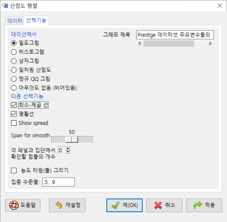 <선택기능> 창에서 <대각선에서>는 <밀도그림>을 선택하고, <다른 선택 기능>에서는 <최소-제곱 선>, <평활선>을 선택하고, 그래프 제목을 추가한다.