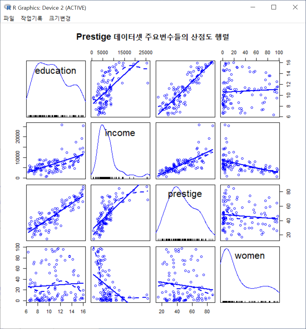 아래와 같은 그래픽장치 창에 산점도 행렬이 등장한다. education, income, prestige, women 이라는 네개의 변수 각각의 밀도함수가 변수 이름과 함께 작성되어 있으며, 행렬 매 칸마다 두개의 변수 사이의 산점도가 제공된다. 행렬 칸 바깥에 있는 숫자들은 수치형 변수들의 사례 값 범위를 요약해서 보여준다.
