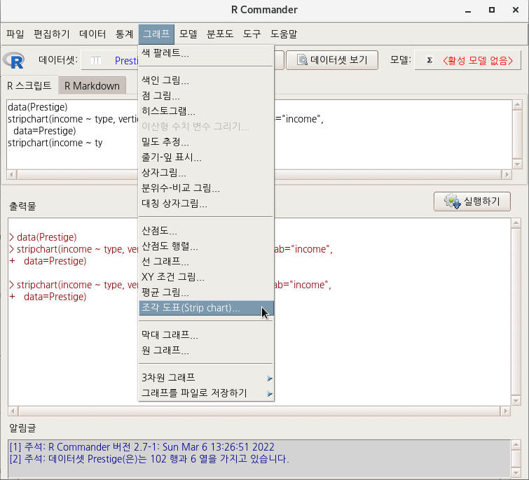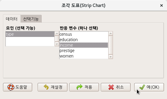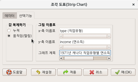 아래 그래픽장치 창에 '조각 도표(Strip chart)'가 제작된다. 직업유형별로 연소득의 사례들이 크기별로 표시되어 있음을 알 수 있다.