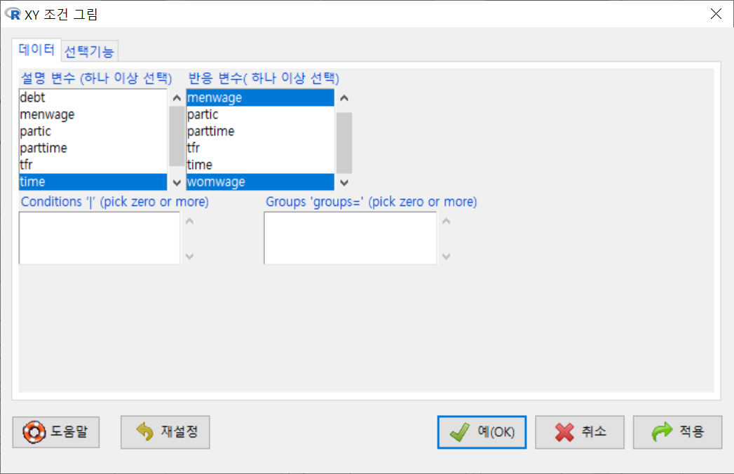 <선택기능> 창에 있는 <그림 유형(하나 또는 둘 모두)>에 점/줄(선) 모두 선택해보자. 물론 <그림 이름표>에 내용을 추가할 수도 있다.