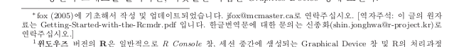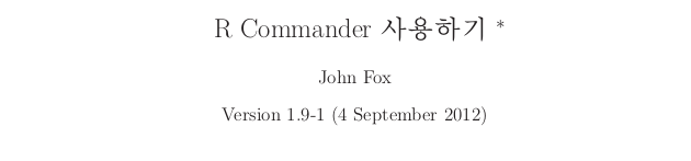 Getting-Started-with-the-Rcmdr-ko.pdf라는 한글 문서에 관련된 이야기를 하고자 한다. 이 문서는 현재 관리되고 있지 않다. John Fox 교수님이 배포하는 Rcmdr 소스 파일에 포함되어 있지만, Rcmdr 업그레이드와 관련된 관리가 되지는 않는다. Fox 교수의 자상함 때문일지, 아니면 Rcmdr 패키지의 안정적 구조 설계에 의해서 버전이 업그레이드되어도 그 문서가 어느정도 유효하다고 생각하시는지 모르겠지만 말이다.