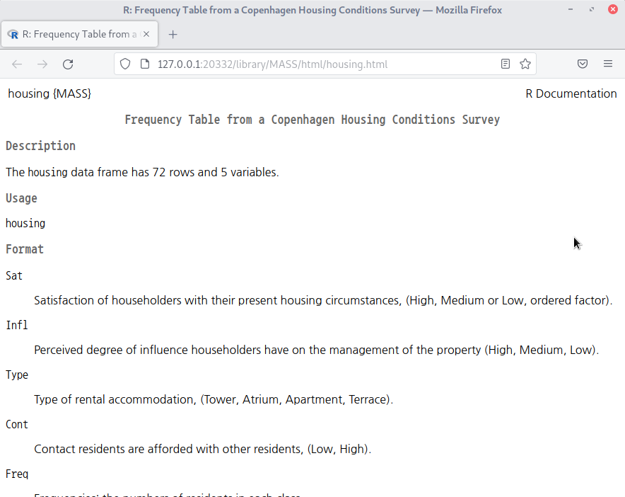 위의 화면은 MASS 패키지가 적재되었고, 또 그 안에 포함된 housing 이라는 데이터셋이 활성화된 상태에서 '도움말 > 활성 데이터셋에 관한 도움말 (만약 이용가능하다면)' 메뉴 기능을 이용할 수 있다는 것이다. 해당 메뉴를 선택하면, 새로운 웹 브라우저 창이 등장하면서, 활성 데이터셋의 도움말이 제공될 것이다.