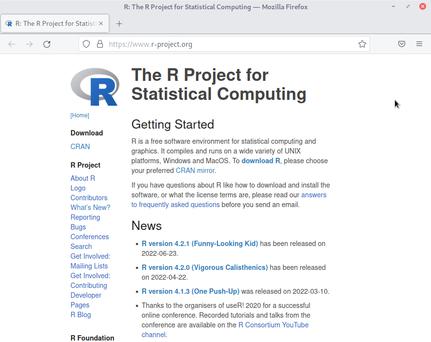 웹 브라우저 창이 등장하고, R 재단의 홈페이지( https://www.r-project.org/ )가 열린다.