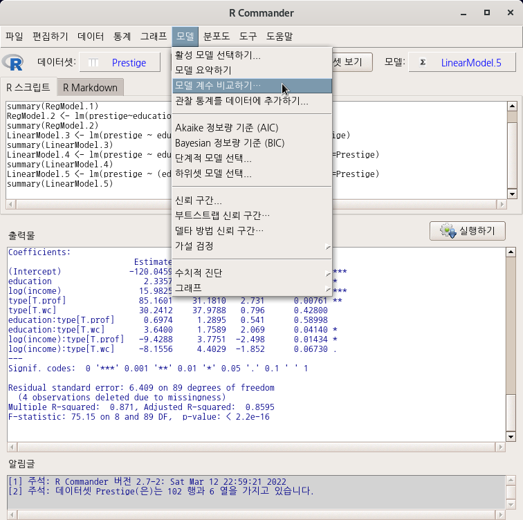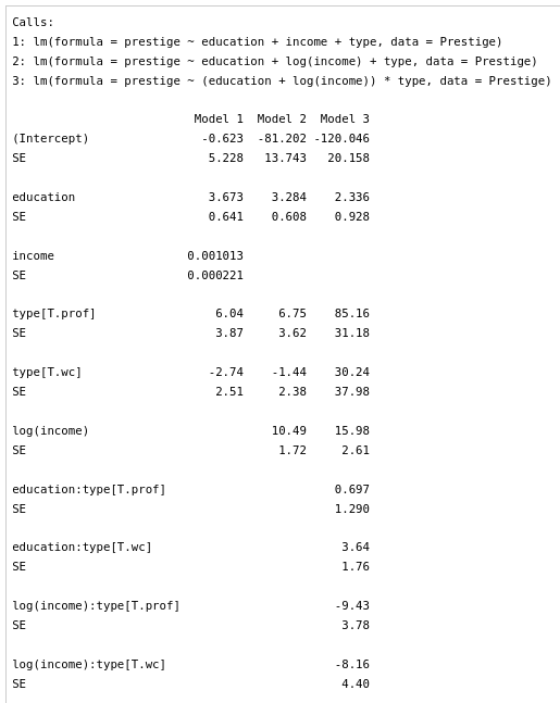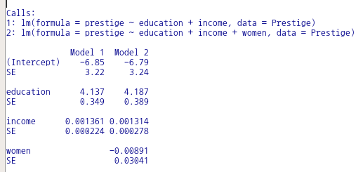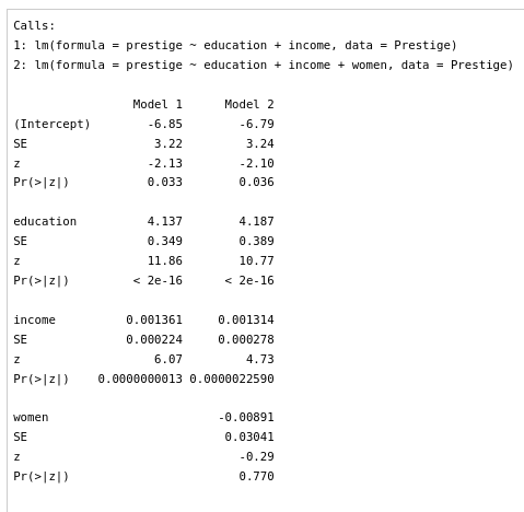 carData 패키지에 있는 Prestige 데이터셋을 이용하여 income(연수입)과 education(교육연수)가 prestige(직업의 사회적 권위)에 미치는 영향에 대하여 분석한다고 가정하자. 최적의 모델을 찾기 위해서는 먼저 여러개의 모델을 만들어야 한다. 이 경우, 만들어진 여러개의 모델을 비교하는 과정에서 영향력이 통계적으로 지지되는 변수들을 찾고 또 그 계수에 대한 꼼꼼한 점검을 해야하는 경우가 많다.