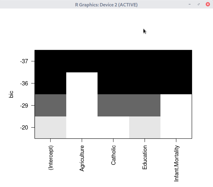 그래프에서 bic값이 가장 작은 숫자를 찾고, 이것과 연결된 설명변수 후보들 목록을 살펴보자. 검은색으로 표현된 것은 포함된 것, 흰색(공백)으로 표현된 것은 비포함된 것, 다른 말로 제거되어야 할 것이다. 그래프에서는 Examination 변수가 포함되지 않은 모형의 bic 값이 가장 작은 것을 알려준다.