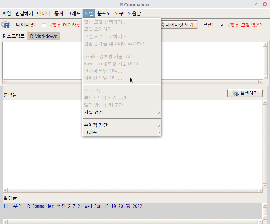 '데이터 > 패키지에 있는 데이터 > 첨부된 패키지에서 데이터셋 읽기' 메뉴 기능을 선택하여 datasets 패키지에 있는 swiss 데이터셋을 찾고 선택한다.