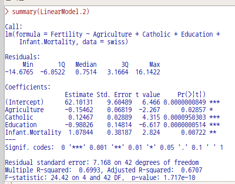 Infant.Mortality, data=swiss) # 문제의식과 연관된 설명변수 후보들을 모두 선택하여 모형만들기