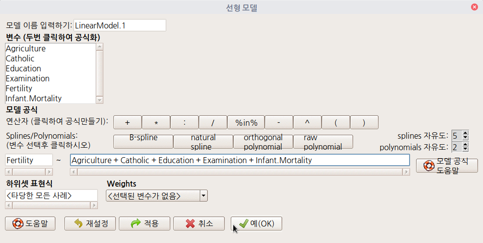 '통계 > 적합성 모델 > 선형 모델...' 메뉴 기능을 사용하여 swiss 데이터셋의 변수들 중에서 Fertility를 반응변수로, 나머지를 추천된 설명변수 후보로 가정하고, 선형 모델을 아래와 같이 만든다.