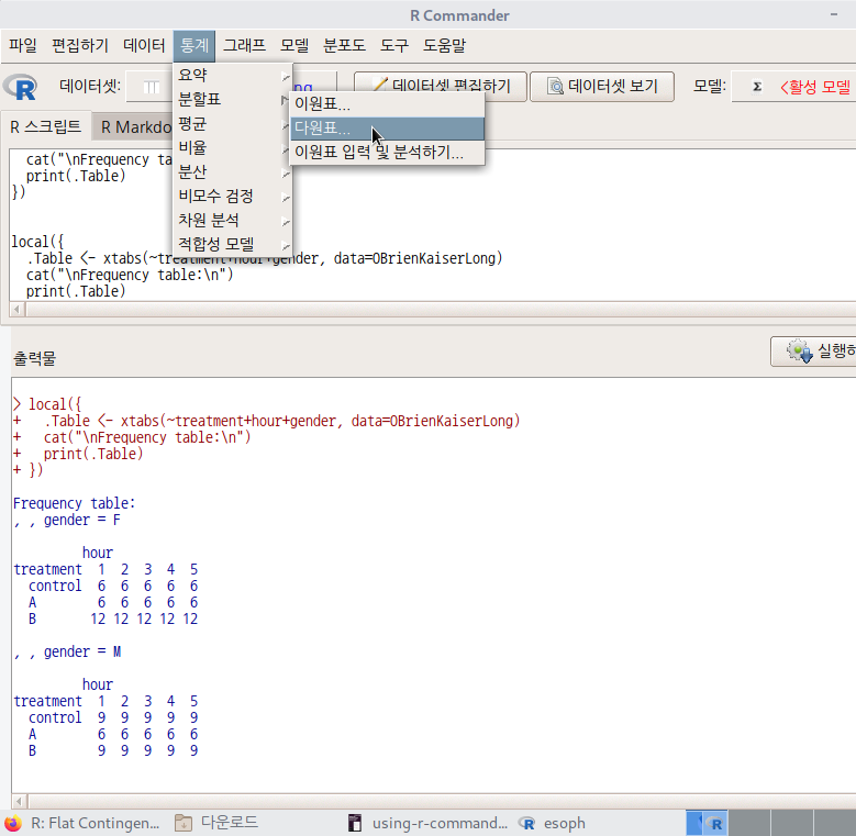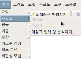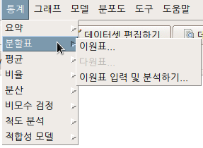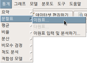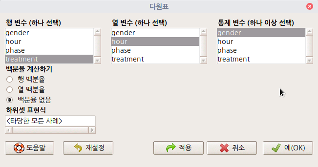 3개 이상의 요인형 변수를 포함하는 데이터셋이 활성화되면, '통계 > 분할표 > 다원표...' 메뉴 기능을 이용할 수 있다. 아래 메뉴 창에서 '통제 변수 (하나 이상 선택)'을 점검할 필요가 있다. 이원표를 만드는 기준 범주가 된다.