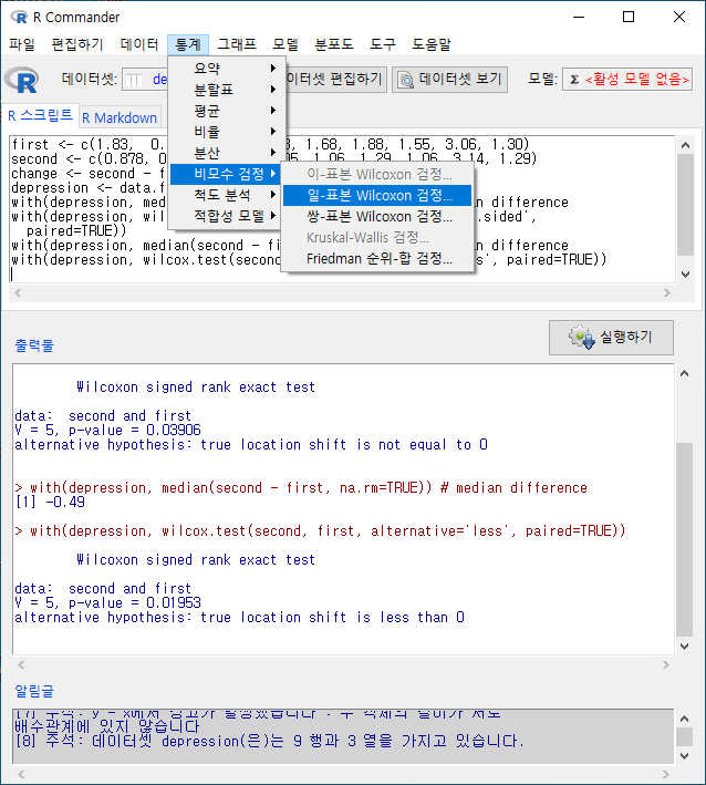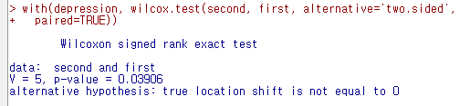 <선택기능> 창에 있는 기본 선택 사양을 그대로 사용해보자. <대립 가설>에서 '양쪽(측)'이 선택되어 있다. depression 데이터셋의 second 변수와 first 변수 사이에 순위 차이가 있는가를 살펴보는 것이라 할 수 있다.
