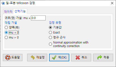 통계 > 비모수 검정 > 쌍-표본 Wilcoxon test...