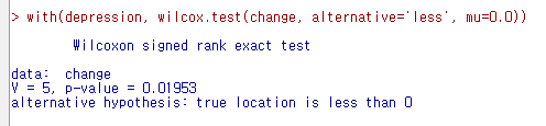 with(depression, wilcox.test(second, first, alternative='less', paired=TRUE))