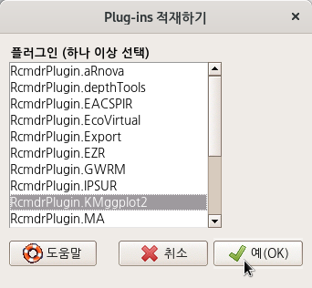 아래와 같이 여러개의 RcmdrPlugin.이름을 가진 플러그인들이 설치되었다고 가정하자. 그 중에서 RcmdrPlugin.KMggplot2를 설치해보자. 적재할 플러그인을 찾아서 선택하고, 예(OK) 버튼을 누른다.