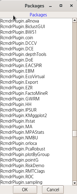 R Commander는 플러그인을 통하여 많은 기능이 확산되는 생태계를 갖고 있다. Rcmdr 플러그인을 사용하기 위해서는 먼저 RcmdrPlugin.이름 을 가진 패키지가 설치되어 있어야 한다.