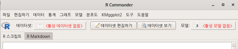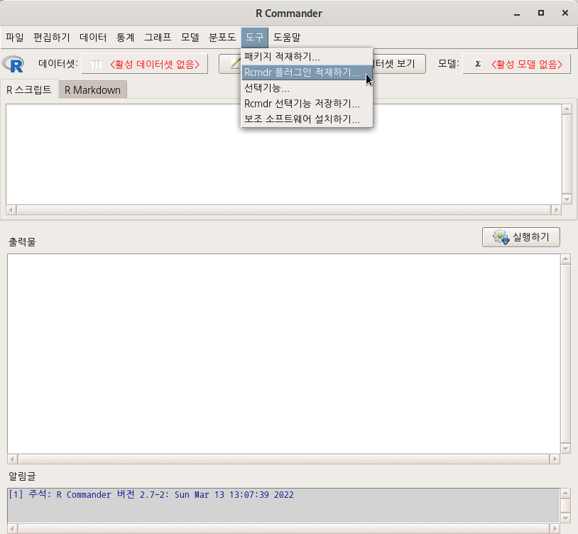 새롭게 등장하는 R Commander 화면 상단을 살펴보자. <분포도>와 <도구> 사이에 메뉴 하나가 추가됨을 알 수 있다. 적재된 플러그인이 메뉴 창에 등장한다.